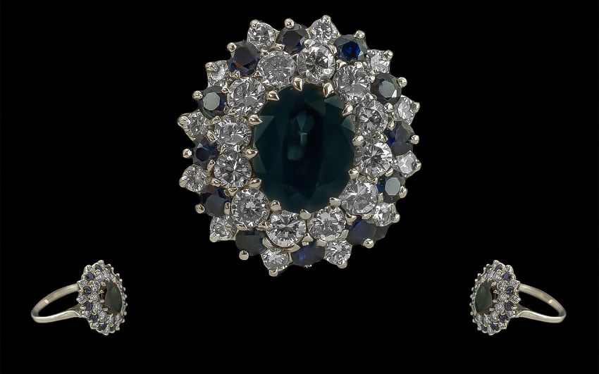 Ladies Impressive 18ct White Gold Blue Sapphire and Diamond Set Large Cluster Ring, marked 18ct to interior of shank, the centre dark blue sapphire surrounded by 12 brilliant cut round diamonds, and those in turn surrounded by an outer 2 rings of 12 small white diamonds and 12 small blue sapphires; total calculated diamond weight 1.92cts, all of excellent colour and clarity; comes with Insurance Valuation for the sum of £2100 (Two Thousand One Hundred Pounds), date 10th September, 2004; weight of ring 7.1g, ring size Q,