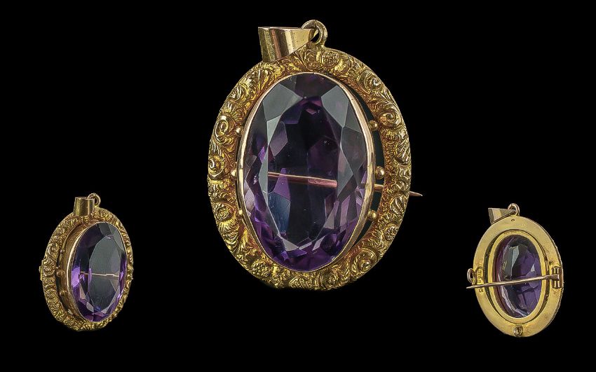 Antique Period Ladies 9ct Amethyst Set Brooch / Pendant. The Large Faceted Amethyst of Good Colour / Clarity, Est Weight 20.00 cts, Weight 10.3 grams. 1,5 Inches - 3.75 cms High.