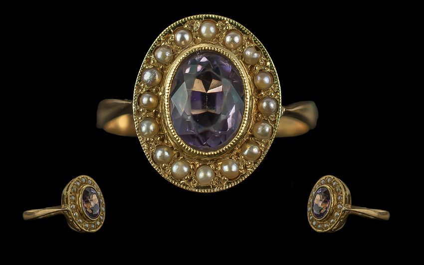 Antique Antique Period Pleasing Quality Ladies 18ct Gold Amethyst and Seed Pearl Set Ring, Marked 18ct to Interior of Shank, The Central Faceted Amethyst of Excellent Colour, Surrounded by Seed Pearls of Good Lustre. Ring Size T. Weight 4.9 grams.
