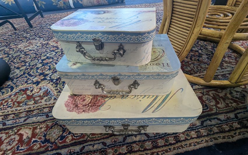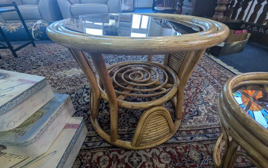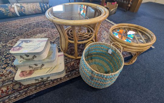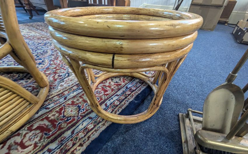 Collection of Bamboo Conservatory Furniture, comprising a circular glass topped table, a small glass topped table, together with three decorative suitcases and wicker plant holder.