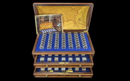 The Danbury Mint Complete Collection 'The State Quarters Treasure Chest' Wooden domed chest with lift up lid revealing 56 plastic cased quarter dollars, with two drawers below containing 672 Quarter Dollars In 56 plastic Tubes.