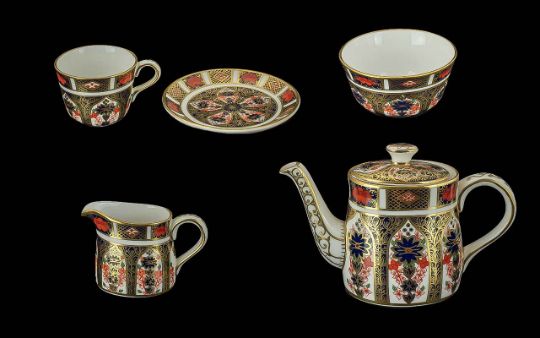 Royal Crown Derby Hand Painted Old Imari Single Gold Pattern Six Piece Singles Miniature / Small Coffee Service. Comprises Coffee Pot, Tray, Milk Jug, Sugar Bowl, Coffee Cup and Saucer. Pattern No 1128, Date 1984.