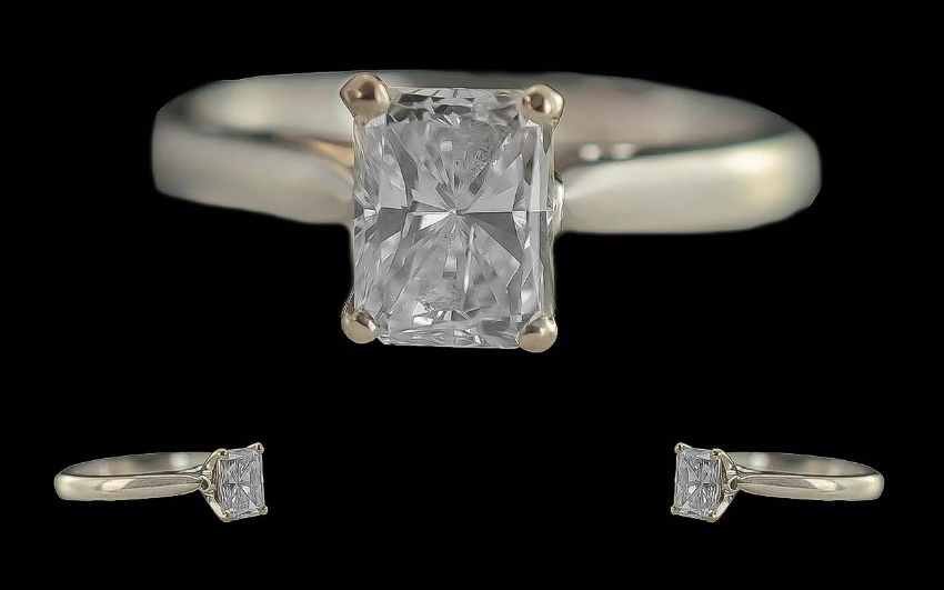 Ladies 18ct White Gold Superb Contemporary Single Stone Diamond Set Ring, full hallmark to interior of shank. The emerald cut diamond of excellent colour and clarity. Colour I, Clarist VS1. Diamond weight 1.00 ct. Ring size L. Weight 3.3 grams. Comes with valuation for insurance, dated 22nd June 2016, for the sum of £6,500. Low estimate.