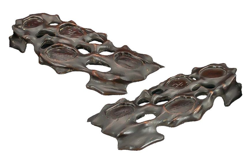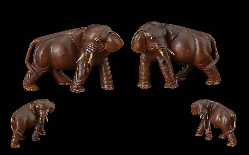 Pair of Carved Wooden Elephants, raised on wooden bases, 7'' high x 11'' long approx.