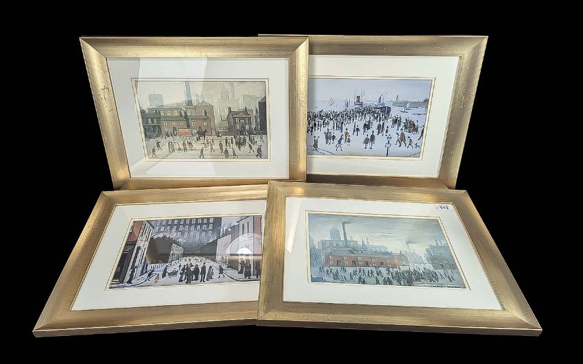 Four Framed Lowry Prints, all mounted, framed and glazed, comprising a mill scene, street scene, a snowy dock scene, and a street scene with a horse and cart.