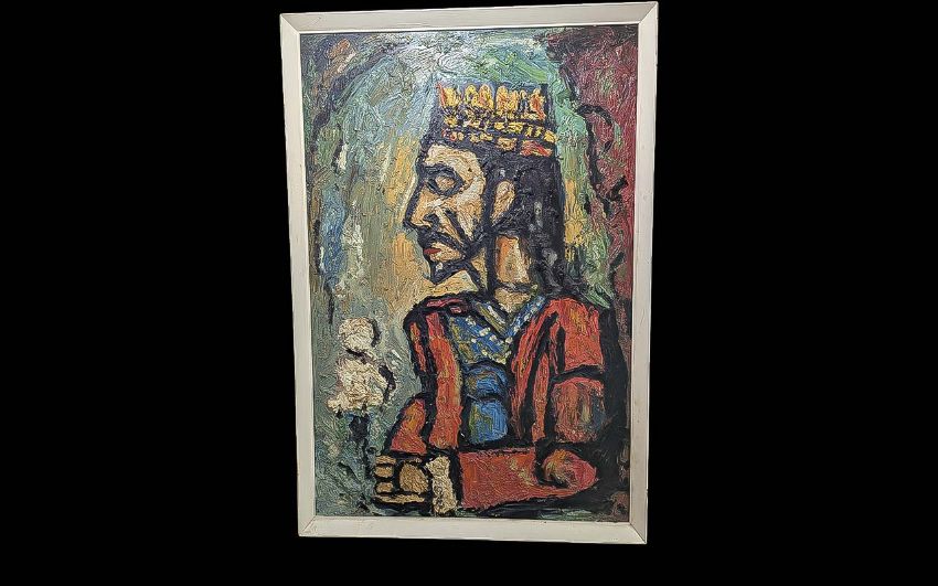 Circle of Francis Newton Souza, (1924-2002) 'The King'. Based on a painting by Georges Roualt. Oil on board, image size 36'' x 23'' (90 cm x 58 cm), framed size 38'' x 25'' (95 cm x 63 cm).