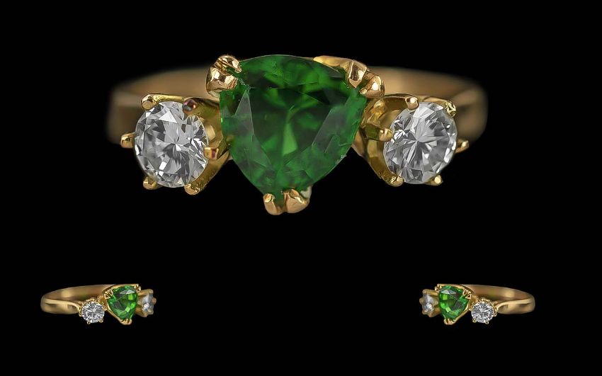 Ladies Attractive and Contemporary 14ct Gold Diamond and Tsavorite Dress Ring, full hallmark to interior of shank, the centre tsavorite of superb green colour, flanked by two faceted diamonds of excellent colour and clarity, est. diamond weight 0.50pts, est. tsavorite weight 1.00ct; ring size Q, weight 3.5g, shank and setting in excellent condition