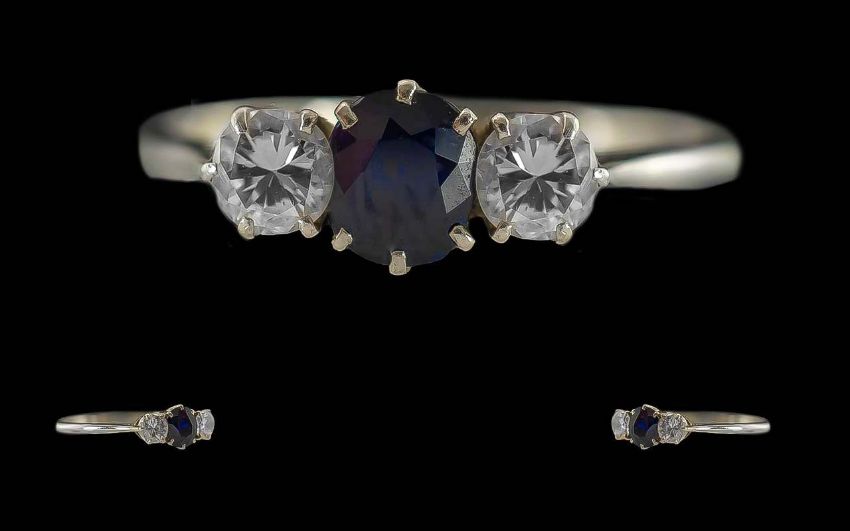 Ladies Pleasing 1930's 18ct Gold 3 Stone Diamond and Sapphire Set Ring, Marked 18ct and Platinum to Interior of Shank, The Central Blue Sapphire Flanked by Two White Faceted Diamonds, Est Diamond Weight 0.40 pts, Ring Size R. Weight 2,2 grams.
