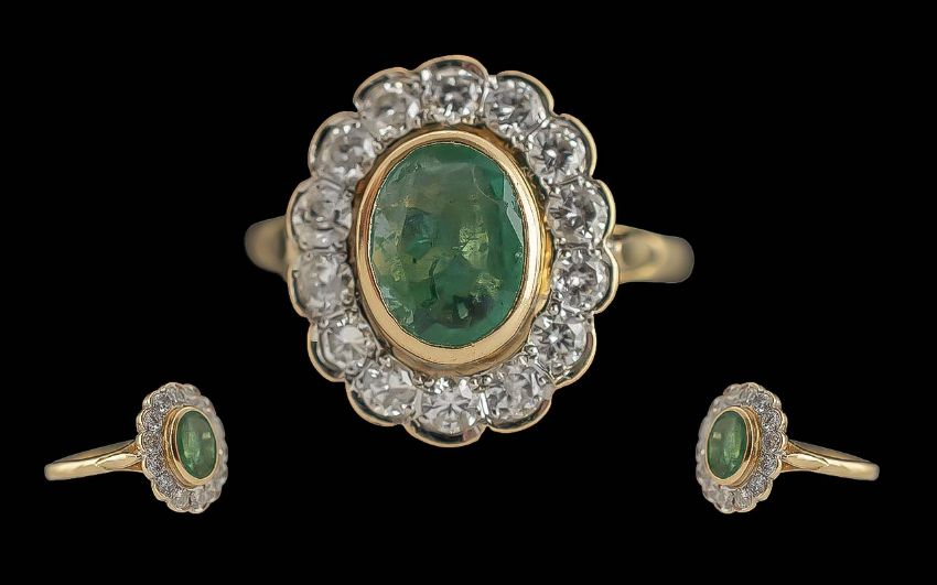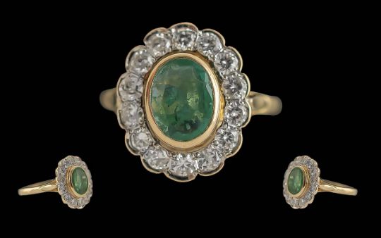 Ladies - Pleasing Quality 18ct Gold Diamond and Emerald Set Cluster Ring, Full Hallmark to Interior of Shank. The Central Oval Shaped Emerald Surrounded by 14 White Faceted Diamonds. Emerald Est Weight 1.50 cts, Diamond Est Weight 1.20 cts. Ring Size N. Weight 4.3 grams. Shank / Setting Very Good Condition.