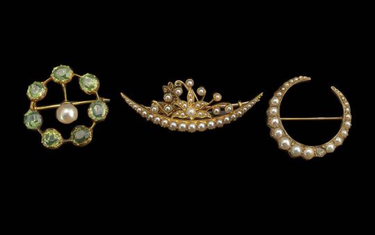 Antique Trio of 9ct & 15ct Gold Brooches Set with Peridots & Seed Pearls. Marked 9ct, Tests 15ct. All Brooches In Good Condition. Total Weight 20.6 grams. Low Estimate.