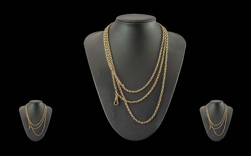 Victorian Period 1837 - 1901 Ladies Quality 9ct Gold Extra Long Guard / Muff Chain. Marked 9ct. Excellent Warm Coloured Gold, All Links In Excellent Condition. Weight 46.7 grams. Length 64 Inches - 160 cms.
