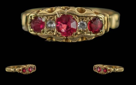 Mid Victorian Period Exquisite Ladies 18ct Gold Ruby & Diamond Set Ring - Well designed setting. Full hallmark For Birmingham 1854 To Interior Of Shank. The Rubies Of Pleasing Colour With Old Cut Diamond Set Spacers. Ring Size (P) Weight 3.2 grams. Shank and setting excellent condition.