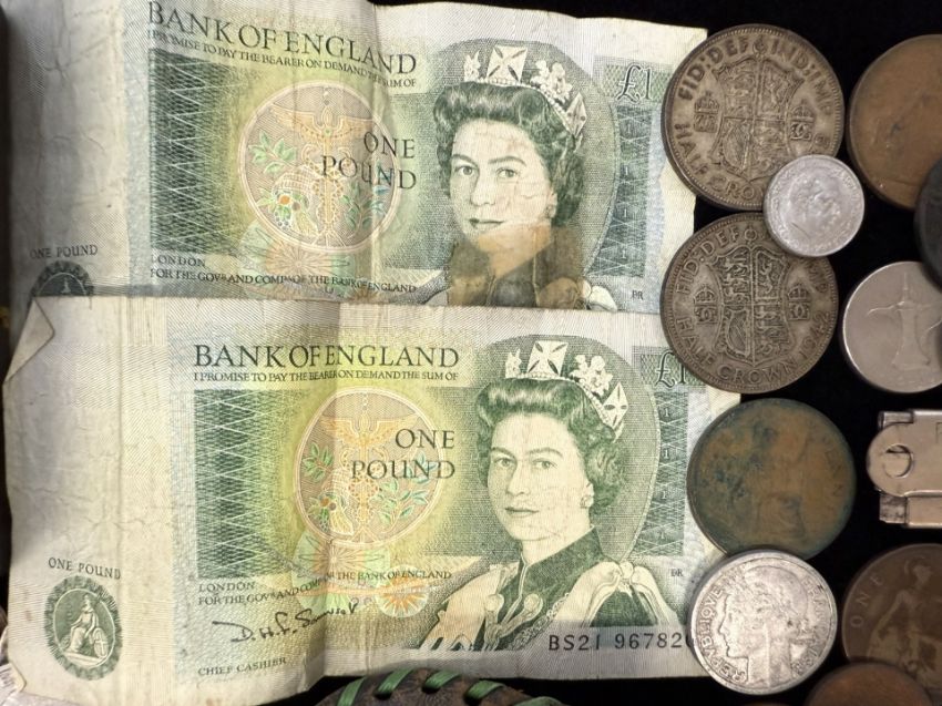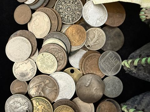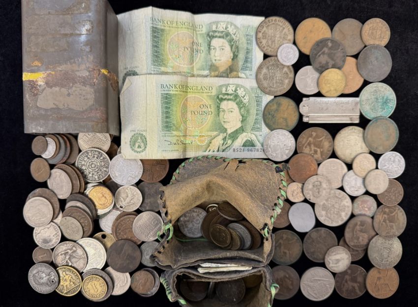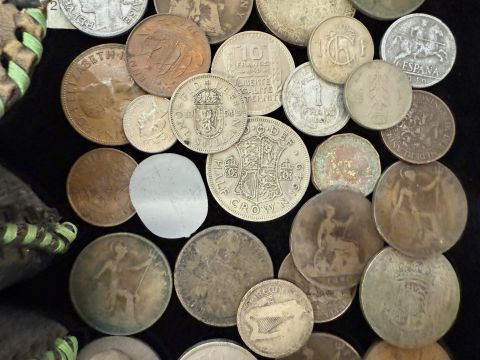 An Old Purse, together with an old tin containing a large amount of mixed coins, some foreign, mostly GB.