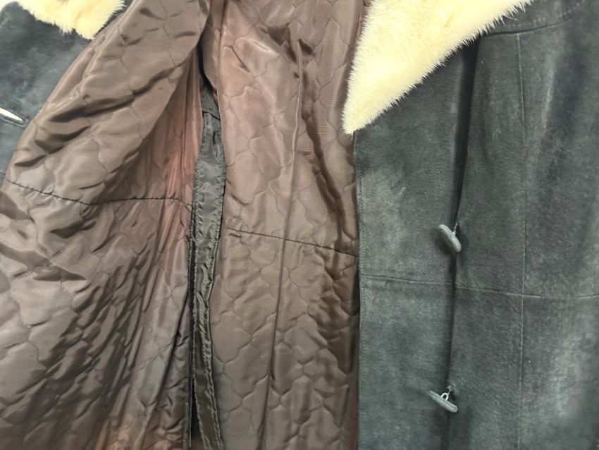 Diana Warren Ladies Black Suede Coat, with white mink collar and cuffs. Button fastening, side pockets. Approx. size 8/10.