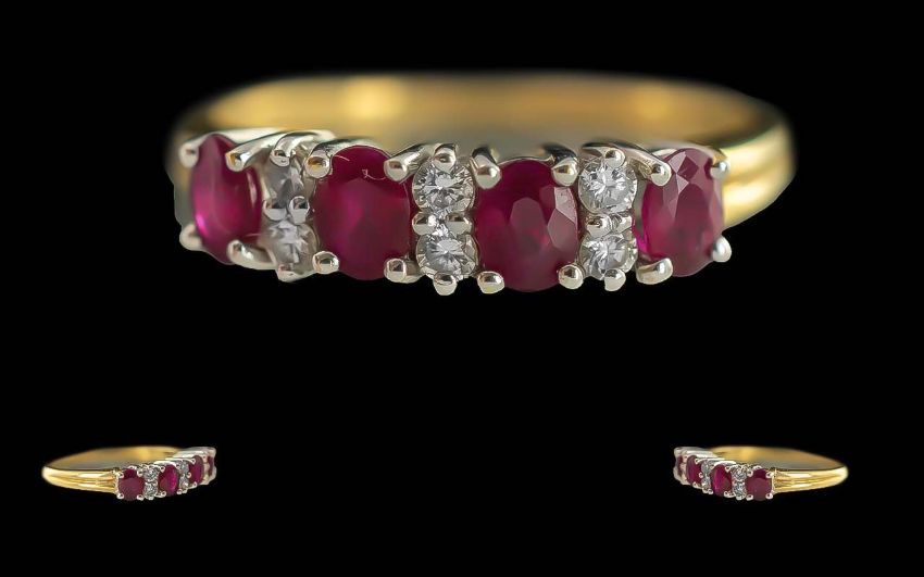 Ladies Fine 18ct Gold Ruby & Diamond Set Dress Ring, full hallmark to interior of shank. The four rubies of excellent colour and clarity with diamond set spacers. Ring size Q, weight 3.5 grams, shank and setting excellent condition.