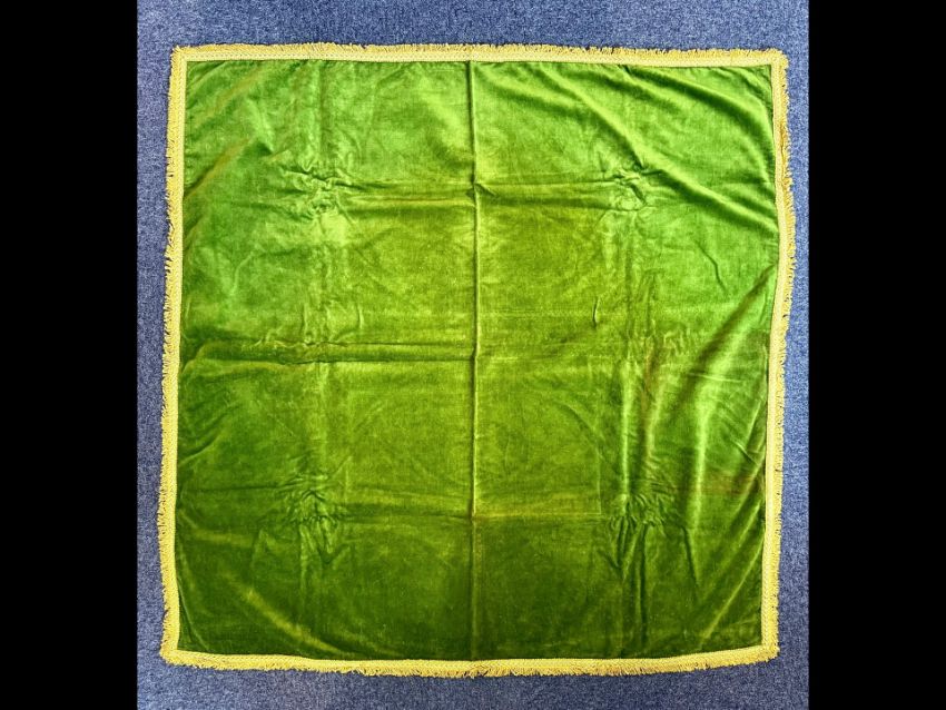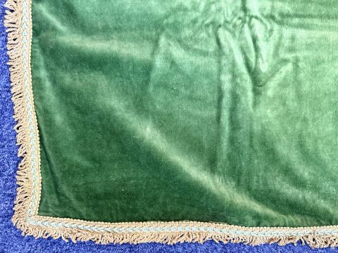 A Victorian Green Velvet Tablecloth, with gold coloured tassel edges, measures approx. 48" x 46".