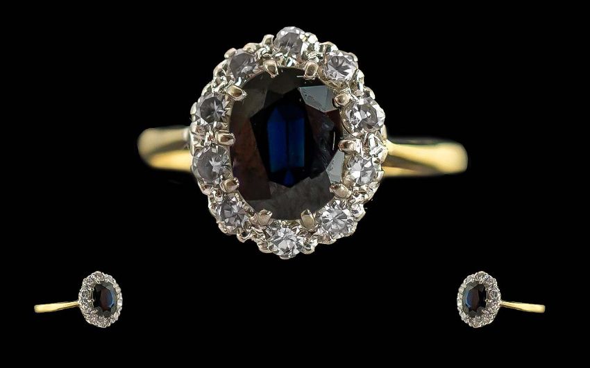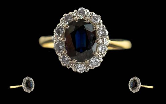 Ladies 18ct Gold Pleasing Diamond and Sapphire Set Ring. Not Marked but Tests 18ct Gold. Central Blue Sapphire of Good Colour, Surrounded by 12 Small Diamonds, Est Weight 0.30 pts, Ring Size L - M. Weight 2.3 grams.