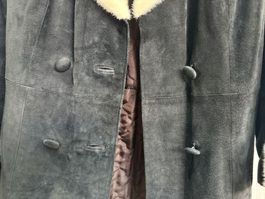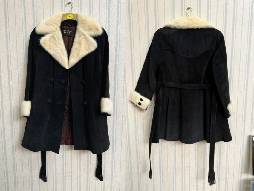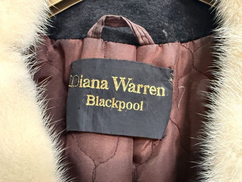 Diana Warren Ladies Black Suede Coat, with white mink collar and cuffs. Button fastening, side pockets. Approx. size 8/10.