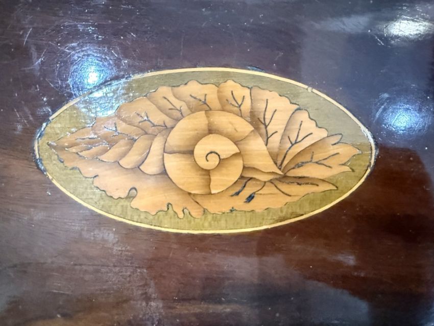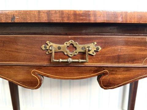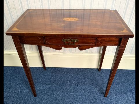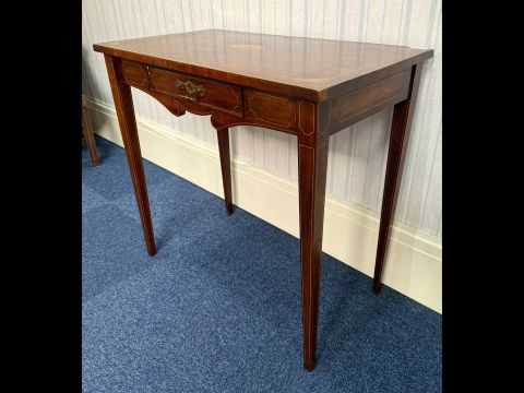 19th Century Mahogany Regency Table, frieze drawer with inlay, tapered legs, height 28" x 29.75" x 17".