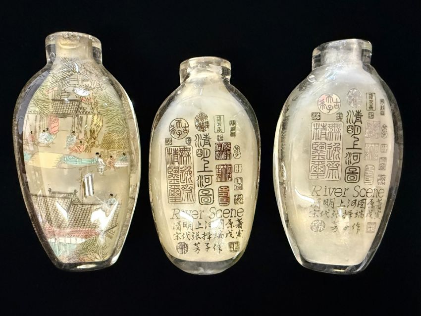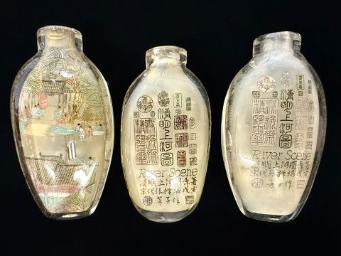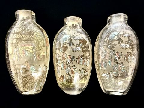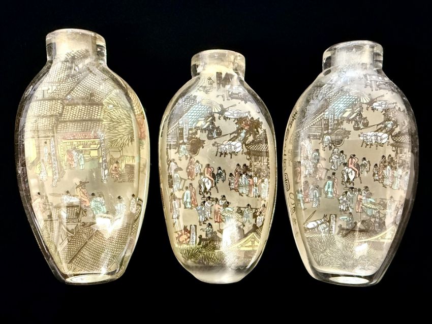 Three Chinese Snuff Bottles. Chinese interior painted glass snuff bottles, painted with figures and horses and boats.