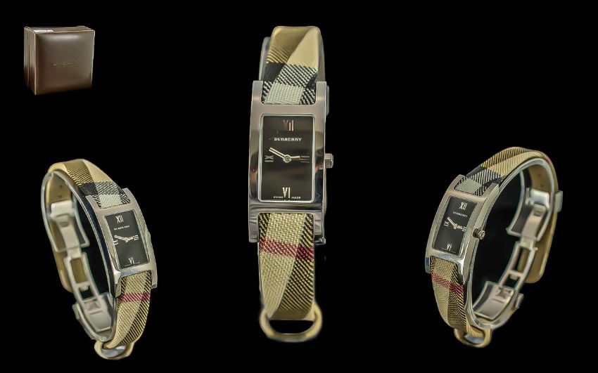 Ladies Burberry Watch with Box & Warranty Card, The Strap In the Original Burberry Pattern. Approx Face Size 2 by 2.5 cms.