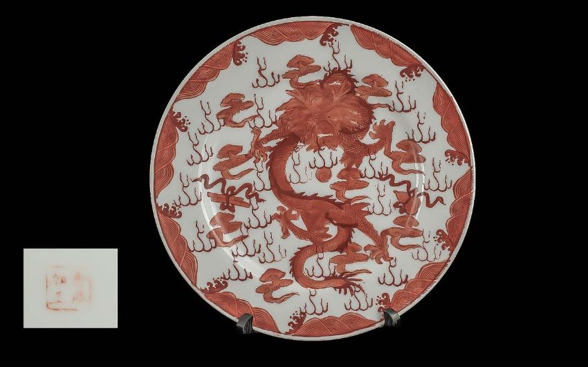 Oriental Plate Decorated with Dragons, Clouds and Landscape. Approx Diameter 10 Inches. Very Good Condition, No Chips, Cracks etc. Stamp to Base.