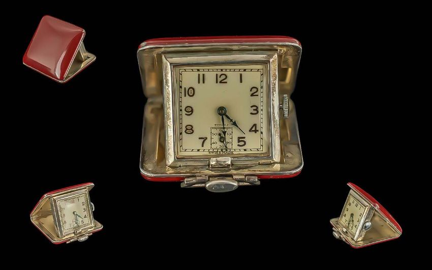 A Ladies Art Deco Enamelled Tivoli Travelling Purse Watch, manual wind, silver frame, maroon enamel.