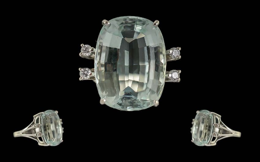 Ladies - Superior Quality 18ct White Gold Aquamarine and Diamond Set Ring. Marks Rubbed but Tests 18ct Gold. The Large Faceted Aquamarine of Top Colour and Clarity. Est Size 6.00 cts, Flanked by 4 White Diamonds, Ring Size N. Weight 8 grams. Shank / Setting Excellent Condition.