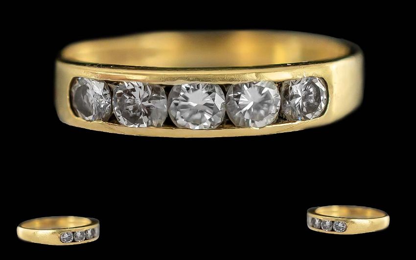 Ladies - Excellent 18ct Gold 5 Stone Diamond Set Channel Ring, Marked with Full Hallmarks to Interior of Shank. The Well Matched Diamonds of Good Colour / Clarity. Ring Size R. Weight 4 grams.