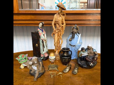 Box of Miscellaneous Modern Oriental Items, to include figures, tallest 18", vases, dragon figure, etc. Together with small brass items.