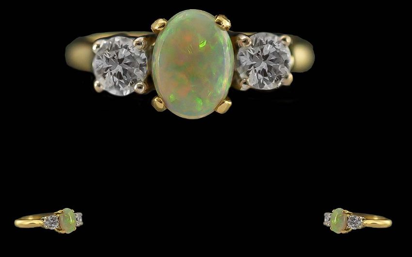 Ladies Excellent 18ct Gold 3 Stone Diamond and Opal Set Ring. Full Hallmark to Interior of Shank. The Central Opal of Excellent Colour, Est 1.00 ct, Flanked by Two Excellent Diamonds of Good Colour. Est Diamond Weight 0.50 pts. Ring Size M - N. Weight 4 grams.