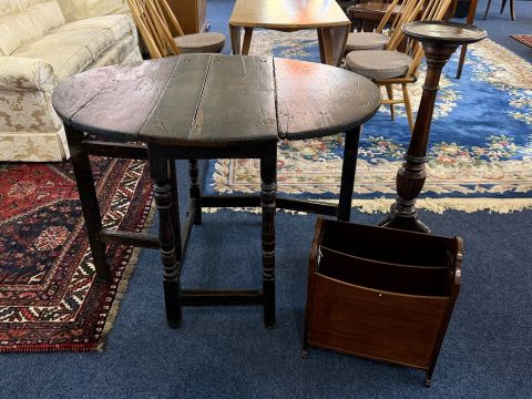 Oak Drop Leaf Table, width 32", height 29", 13.5" closed depth. Together with a 36" high plant stand raised on three legs, and wooden magazine rack, height 16" length 15". All as found.