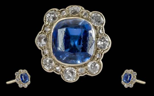 Antique Period Ladies 18ct White Gold Sapphire and Diamond Set Ring, Tests 18ct. The Central Faceted Blue Sapphire of Good Colour / Clarity, Surrounded by 16 Faceted Diamonds of Good Colour. Est Diamond Weight 0,50 pts. Ring Size P. Weight 5 grams.