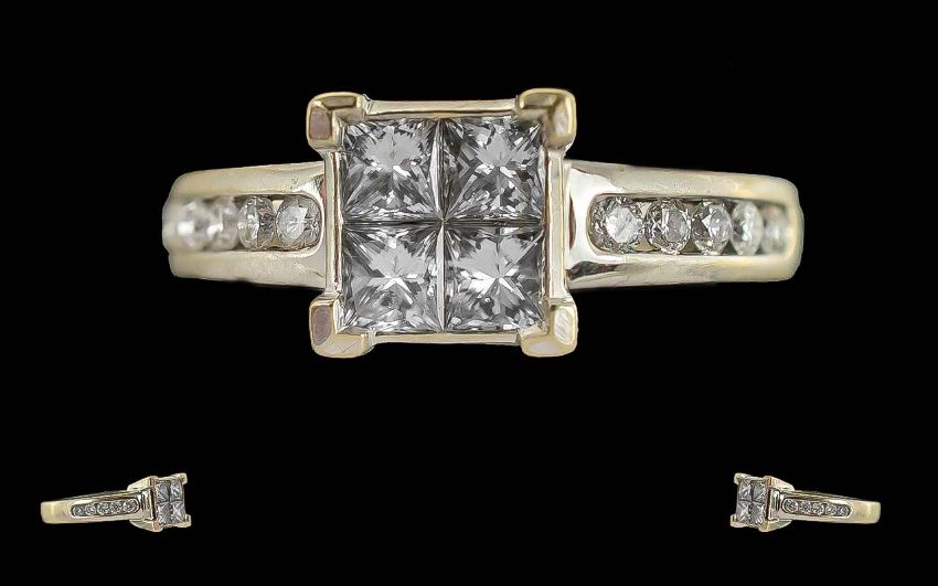 Ladies - Pleasing 18ct White Gold Diamond Set Dress Ring, Full Hallmark to Interior of Shank. The Central Princes Cut Diamond with Brilliant Cut Diamonds to Shoulders of Good Colour / Clarity. Diamond Weight 1,00 ct. Ring Size L. Weight 5.7 grams.
