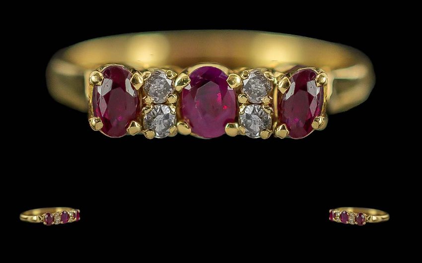 Ladies Attractive / Exquisite 18ct Gold Rubies / Diamond Set Ring, Full Hallmark to Interior of Shank. Rubies and Diamonds of Good Colour / Clarity. Ring Size K. Weight 2,4 grams.