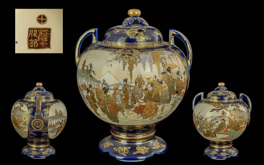 Japanese Meiji Period 1864 - 1912 Excellent Quality and Signed Satsuma Two Handled Lidded Bowl / Censer. Depicts Noble / Men / Family / Attendant, Mount Fiji In Background, Character Marks to Base. Low Estimate. Height 8 Inches - 20 cms.
