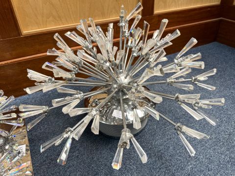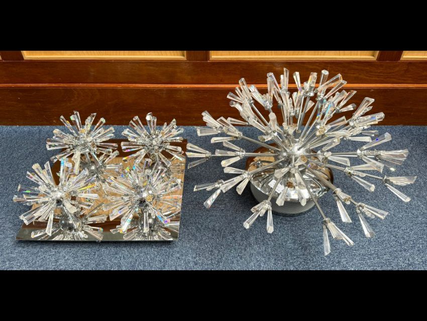 Large Modern Chrome & Crystal Ceiling Light, with four starburst crystal lights on a square chrome base. Measures approx. 15" square. Together with a matching large modern centret light fitting approx. 15" x 24", both as found.