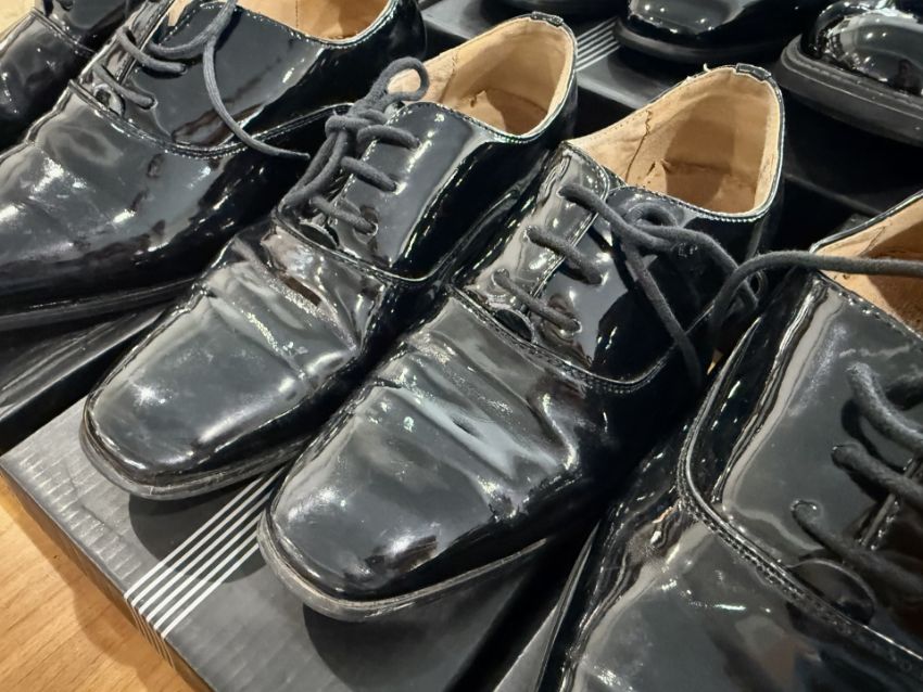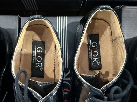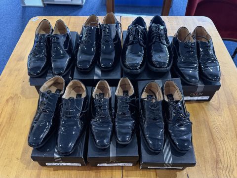 Seven Pairs of Men's Black Patent Leather Dance Shoes, sizes to include 1, 3, 5, 5.5, 6 and 9. All in original boxes, Goor Shoes.