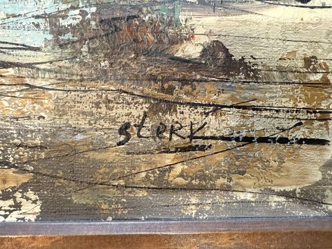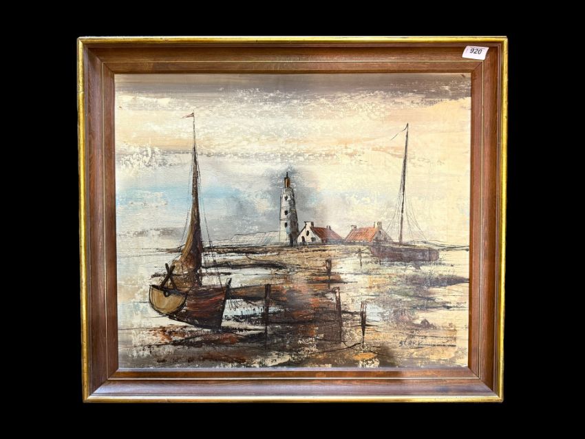Large Framed Oil Painting signed Sterk, depicting ships in a harbour. Measures 24" x 27" overall.