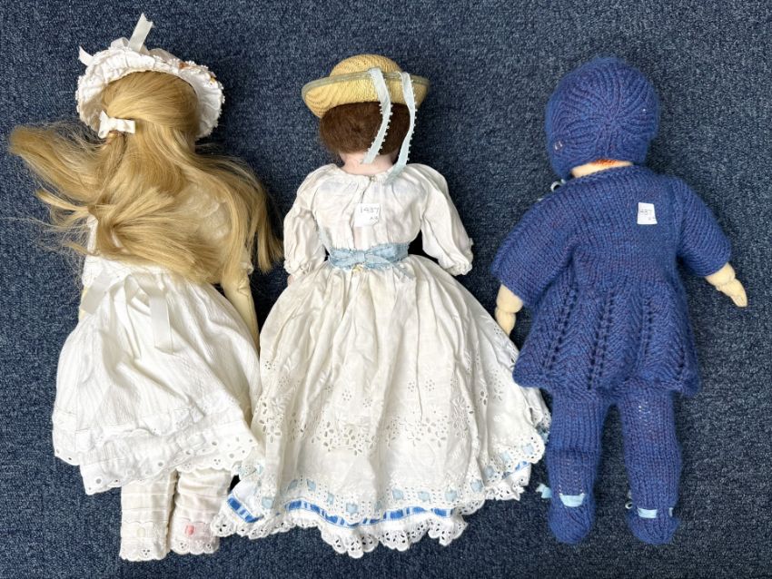 Three Porcelain Headed Dolls, comprising 'Daisy' circa 1910, marked 4/0, dressed in white and blue with hat, approx. 16'', an 18'' doll with fabric body wearing a white dress and bloomers, and a fabric bodied doll wearing blue knitted outfit, 17'' high.