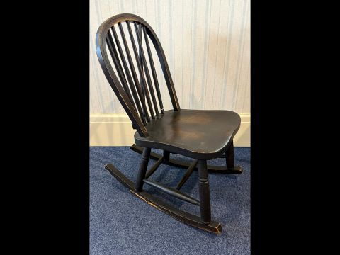 1916 Child's Windsor Style Rocking Chair, made by J Williams. Spindle back, stretchers. Measures approx. 30'' high.