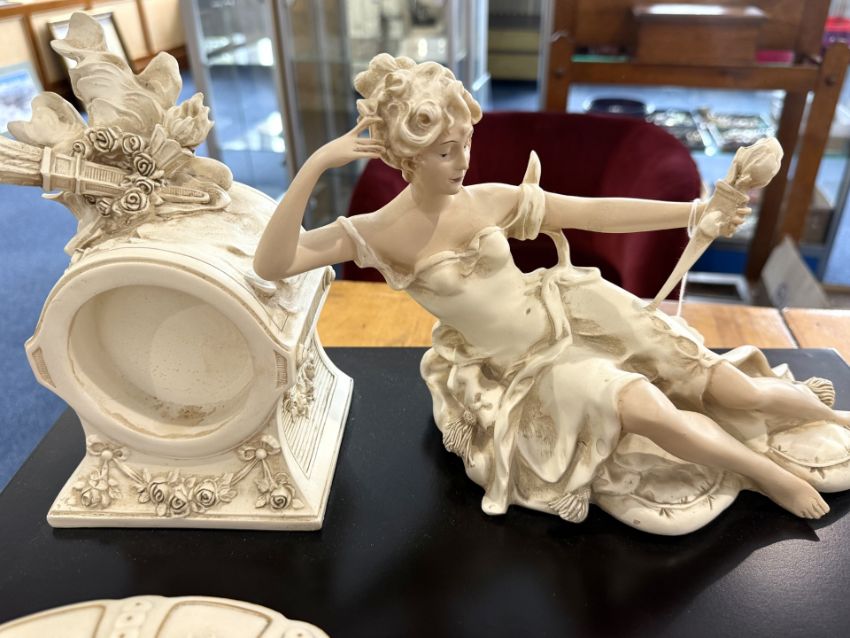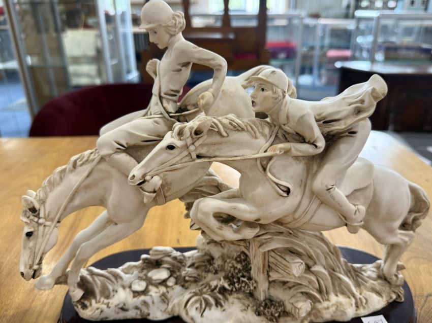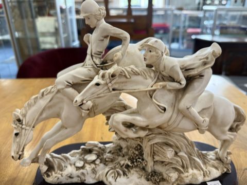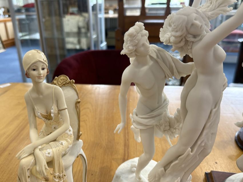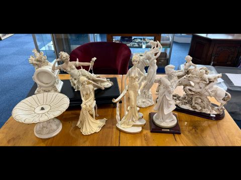 Collection of Seven Resin Figures, to include reclining figure resting on top of a wooden plinth, 19" wide x 12" high, a figure of two mounted riders 14" wide x 12" high, four female figures, one signed B Meni, and a footed bowl with figures at the base.