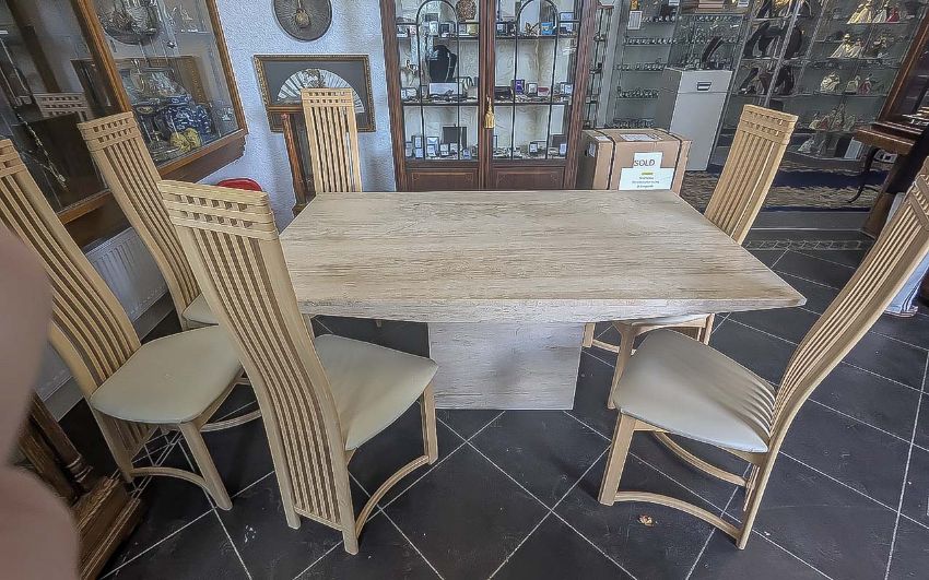 Modern Dining Table & Six Chairs, rectangular marble effect base, supporting a cream marble effect table top. Table measures 67" x 39". Together with six slatted high back dining chairs with curved stretchers and cream leather seats.