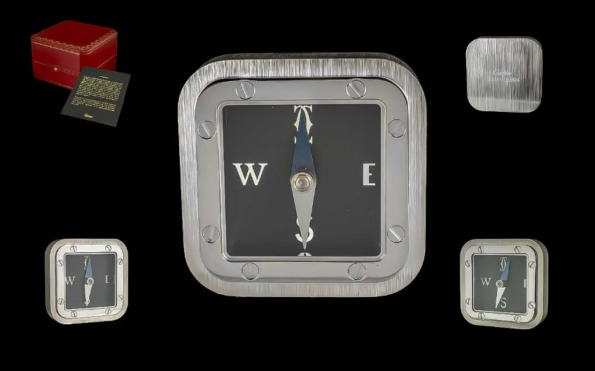 Cartier Santos S.I.H.H 2004 Ltd Edition Paperweight - Compass, With Black Dial and Palladium Finish of Square Form, Santos Design, The Hades Oscillate on a Black Background, With Double C - Cartier Emblem. Size 1.97 x 1.97 ( 50 x 50 mms.) With Cartier Presentation Boxes and Paperwork.