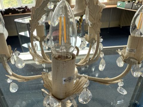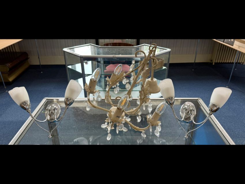 Pair of Chrome and Glass Wall Lights, with two glass shades, together with a cream metal leaf design chandelier light with five arms.