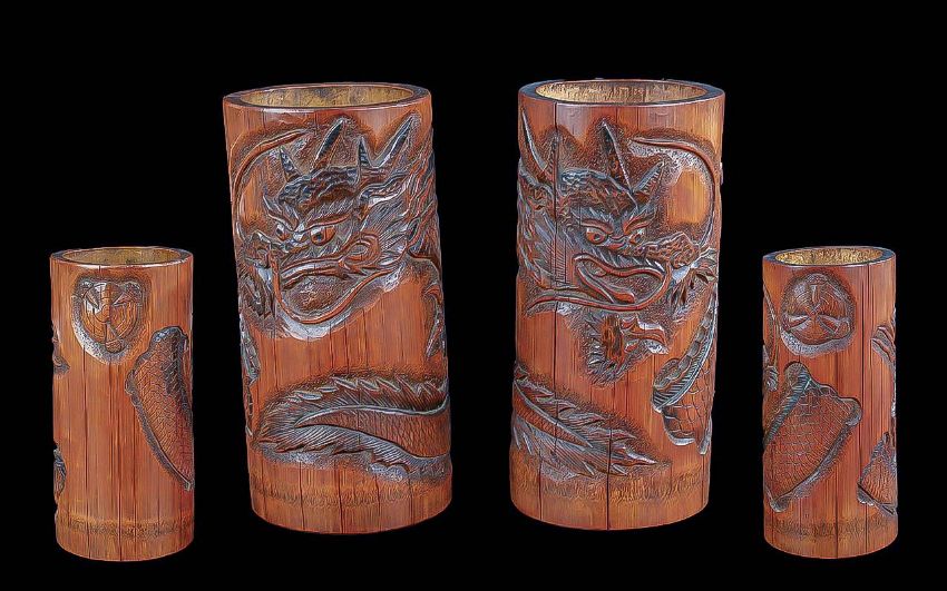 Chinese 19th Century Pair of Carved Bamboo Brush Pots with Carved Images of Dragons to Sides, Excellent Toning. Heights 9 Inches - 22.5 cms. Both Pots In Good Condition.