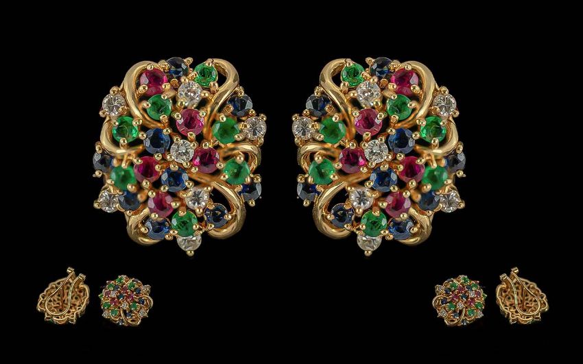 Ladies - Attractive Superior Quality 14ct Gold Multi Gem Set Earrings ( Cluster Form ) For Pierced Ears. Marked for 14ct. Set With Diamonds, Emeralds, Rubies and Sapphires. All of Excellent Colour. Weight 13.1 grams.